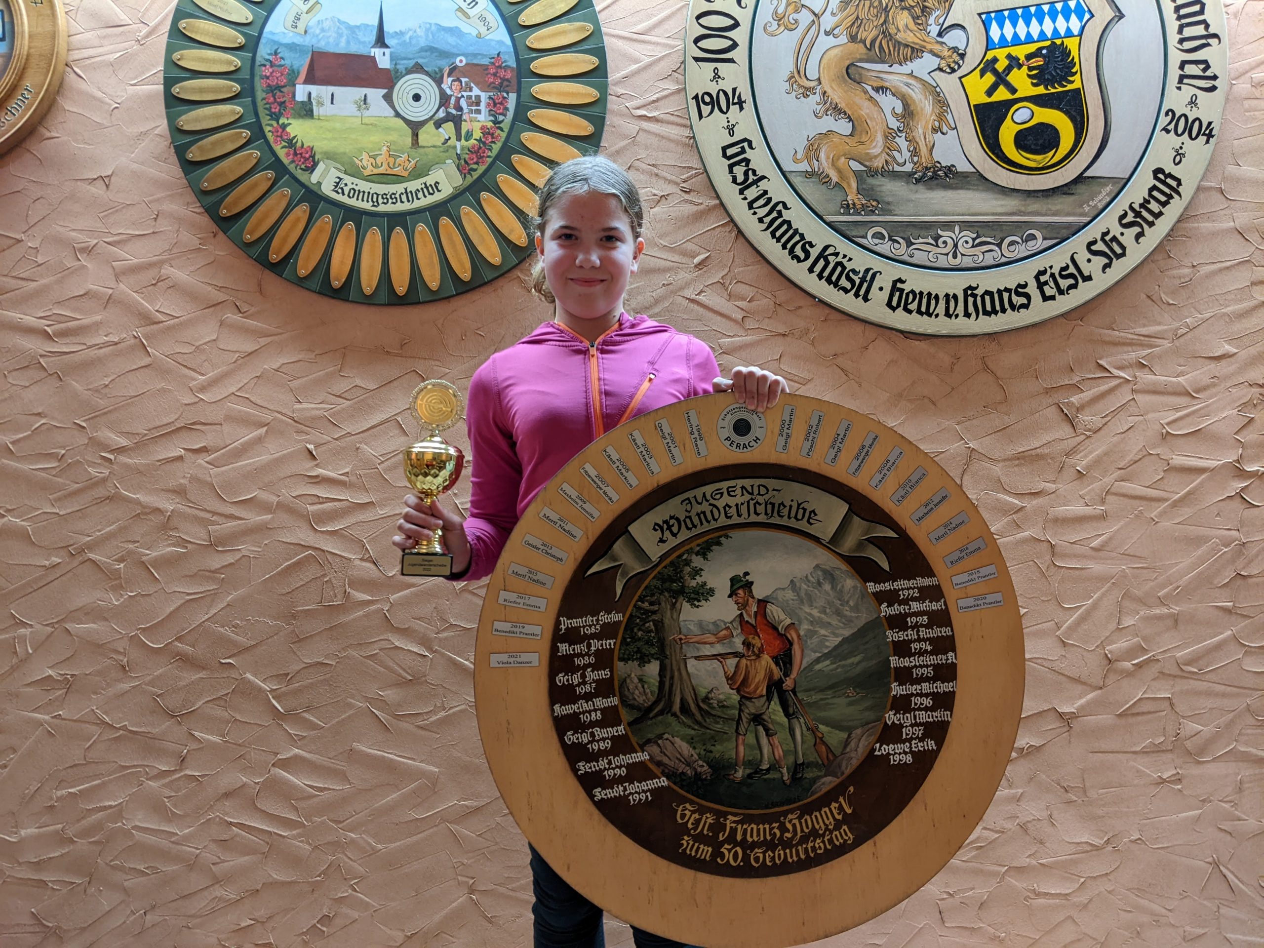 Die vom Ehrenschützenmeister Franz Hogger gestiftete Jugendwanderscheibe ging an Emma Kern mit einem schönen 10er. Zweite wurde Anna Thanbichler vor Zwergerlkönig Ferdinand Lapper. Beide ebenfalls noch mit einem 10er!