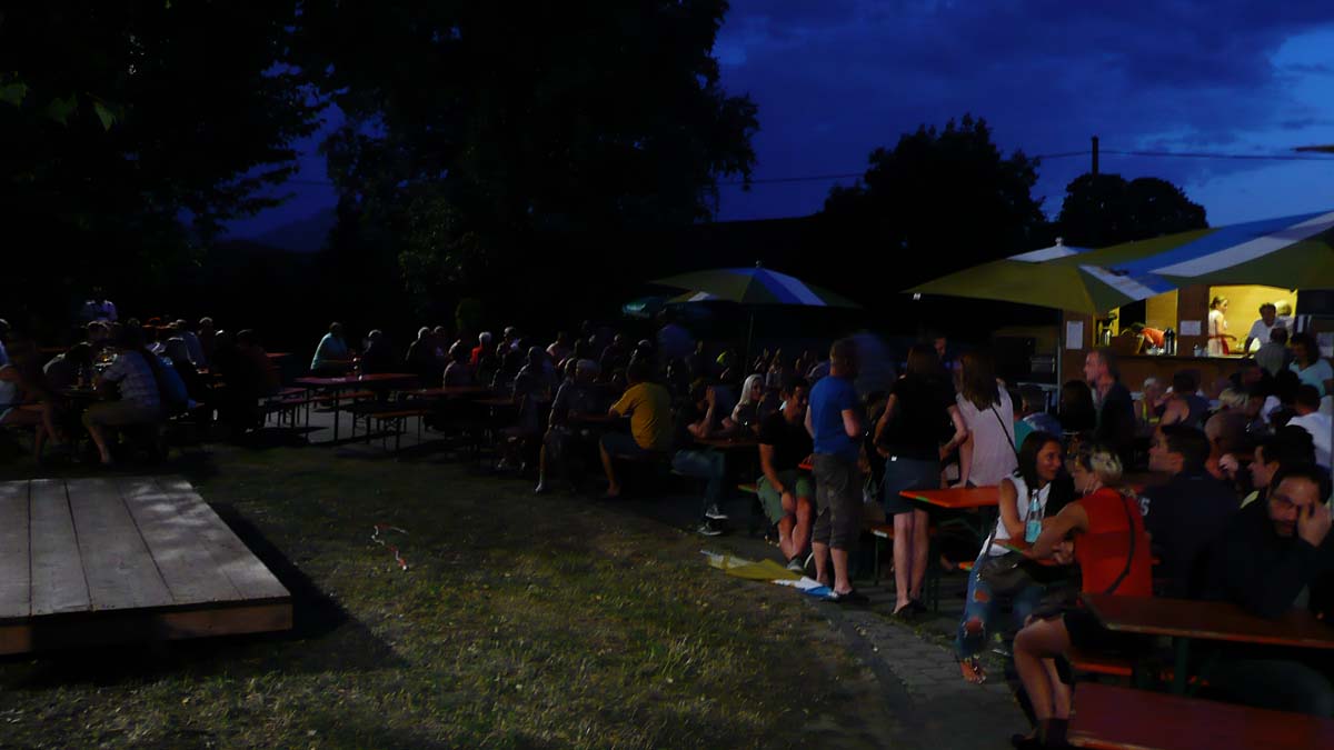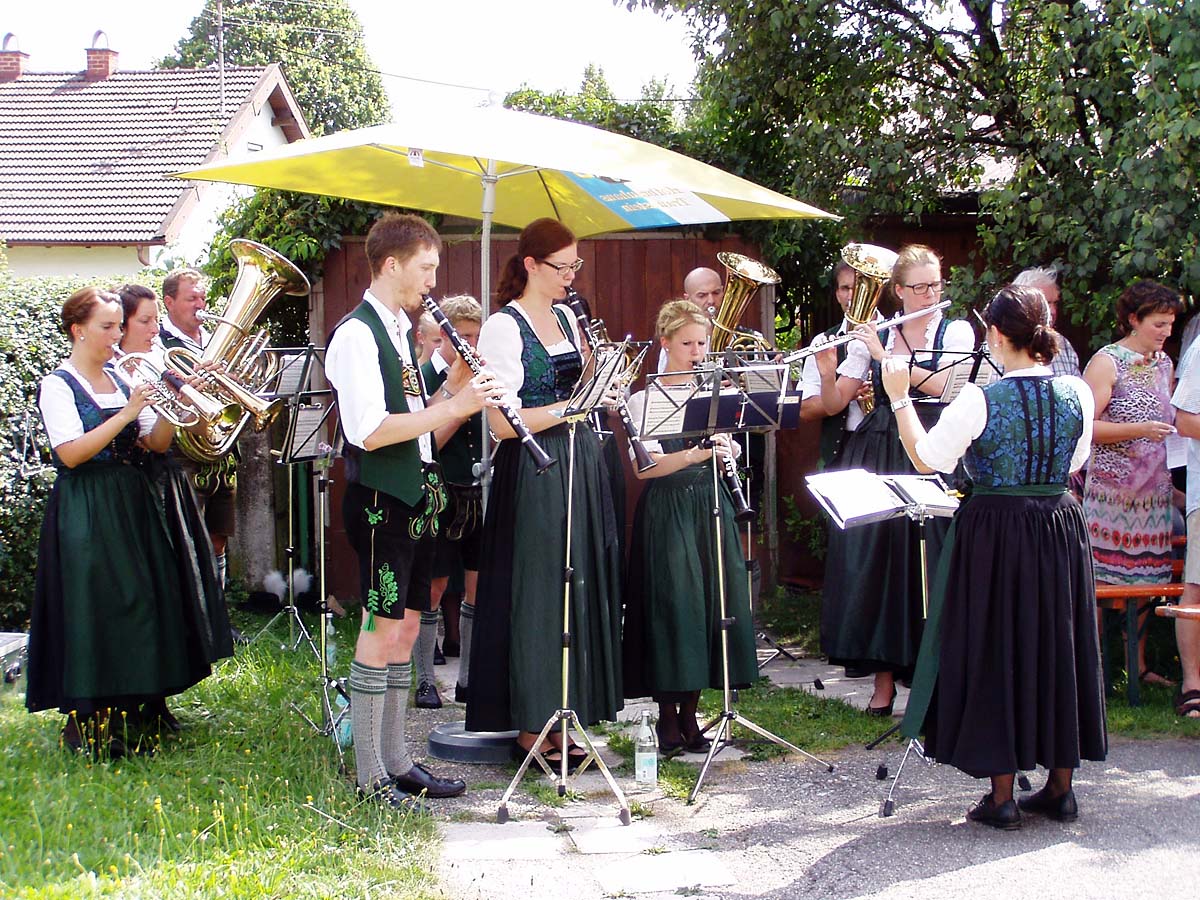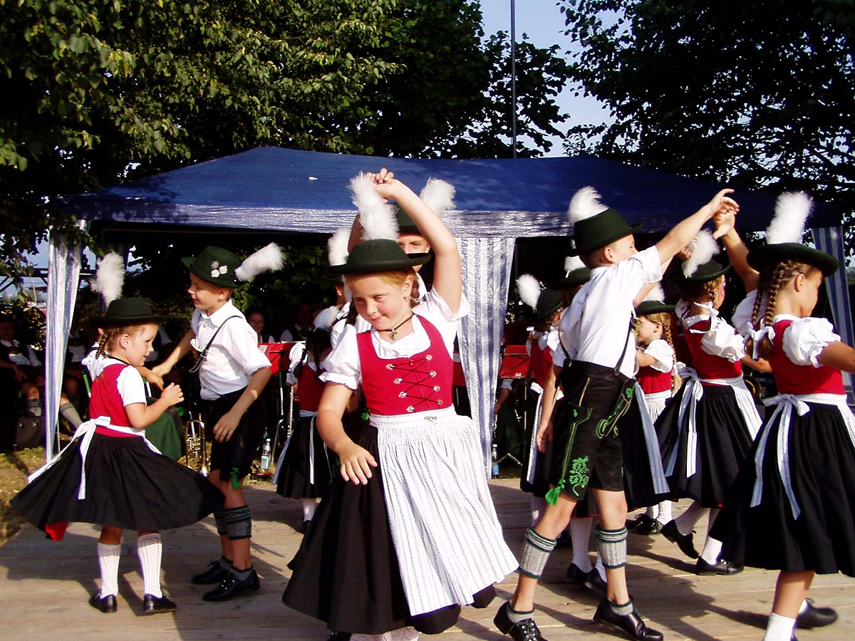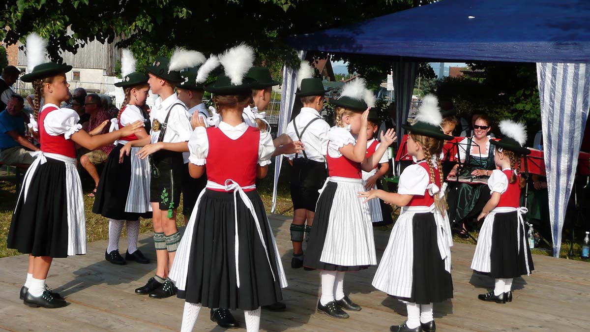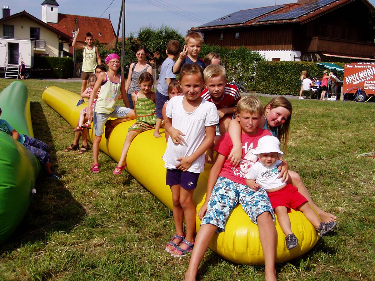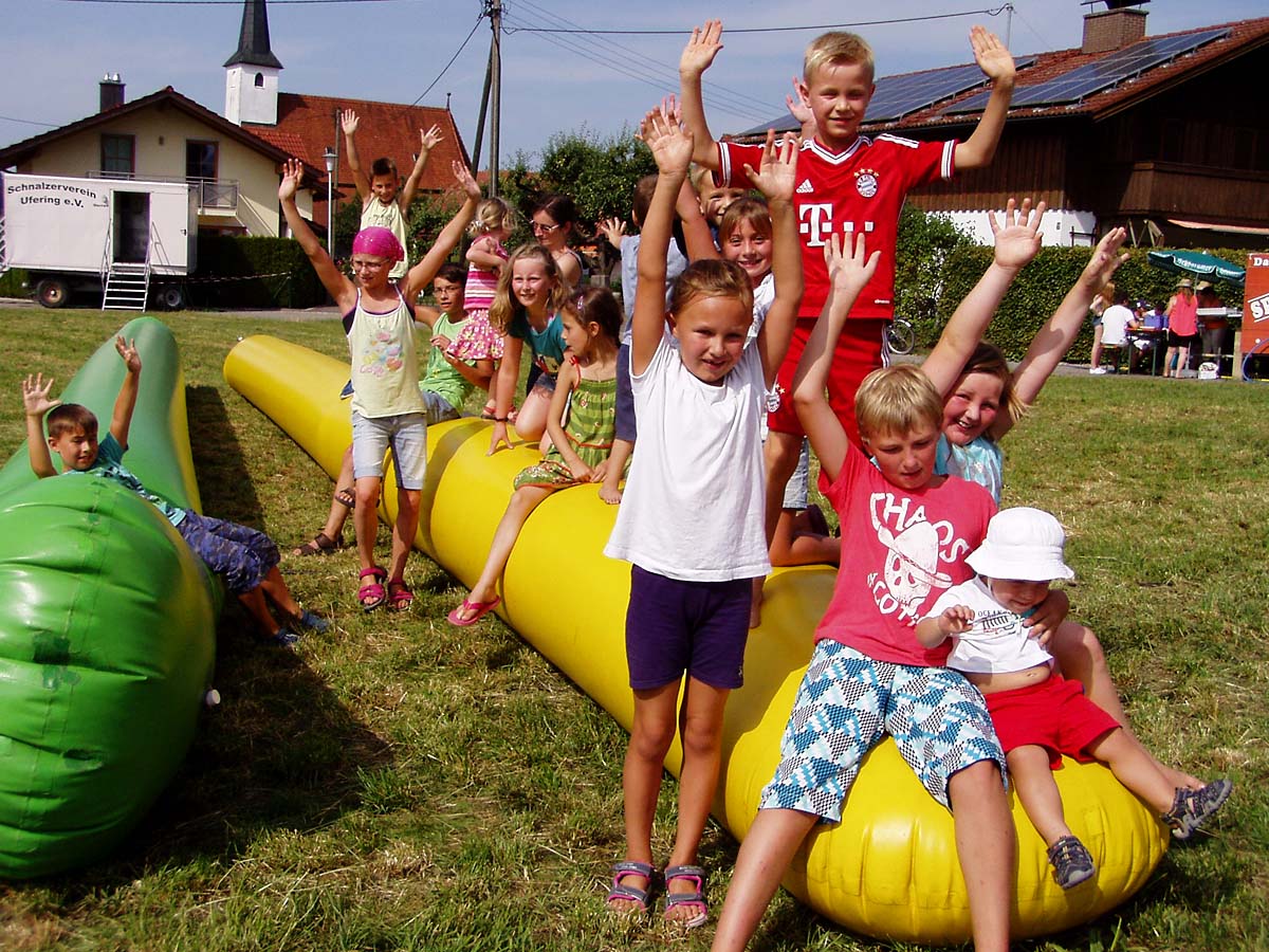 Die Ainringer Musiker, zwischenzeitlich nach und nach in voller Besetzung, spielten noch stundenlang schwungvoll in die laue Nacht hinein. Am späten Nachmittag gehörte die Bühne ganz allein der Hammerau-Ainringer „Edelweiß“-Kinder-Trachtengruppe, welche mit bodenständigen Brauchtumstänze und Plattler die Besucher erfreuten. Geleitet wurden die Buben und Mädels in ihren feschen Vereins-Trachten von Vroni Auer, Andrea Dusch, Andrea Bliem und das musikalische Geleit auf der Diatonischen gab jeweils Hansi Auer. Auf der westlich abgemähten Wiese konnte sich alle anwesenden Kinder nach Belieben auf zwei über 20 m lange „Gummischlangen“ austoben.