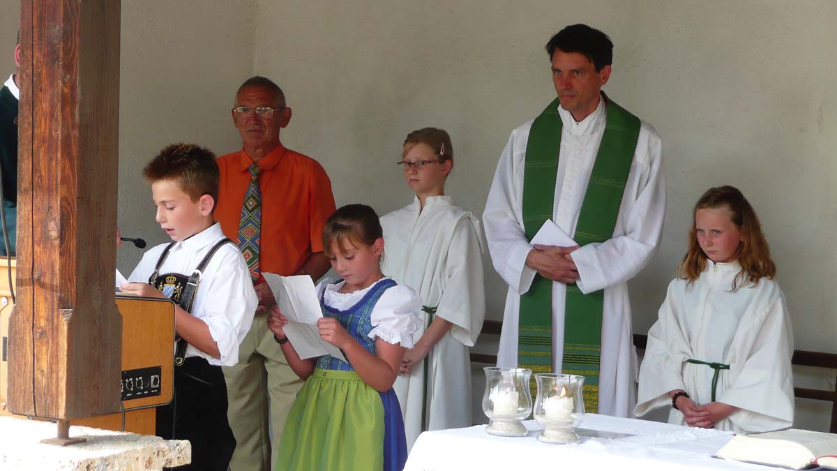 Der Pfarrer riet, wie viele andere Organisationen, Fair-Trade-Produkte zu benutzen und das Bewusstsein stärken „Wir gehören zu einer Welt“. Die vorrangige Aufgabe sei, sie möglichst wohlbehalten den kommenden Generationen zu hinterlassen. Fürbitten sprachen die Kinder Benedikt und Isabell Prantler. Das musikalische Geleit mit Kirchenliedern gab die Musikkapelle Ainring in kleiner Besetzung unter der Leitung von Elisabeth Hogger.
