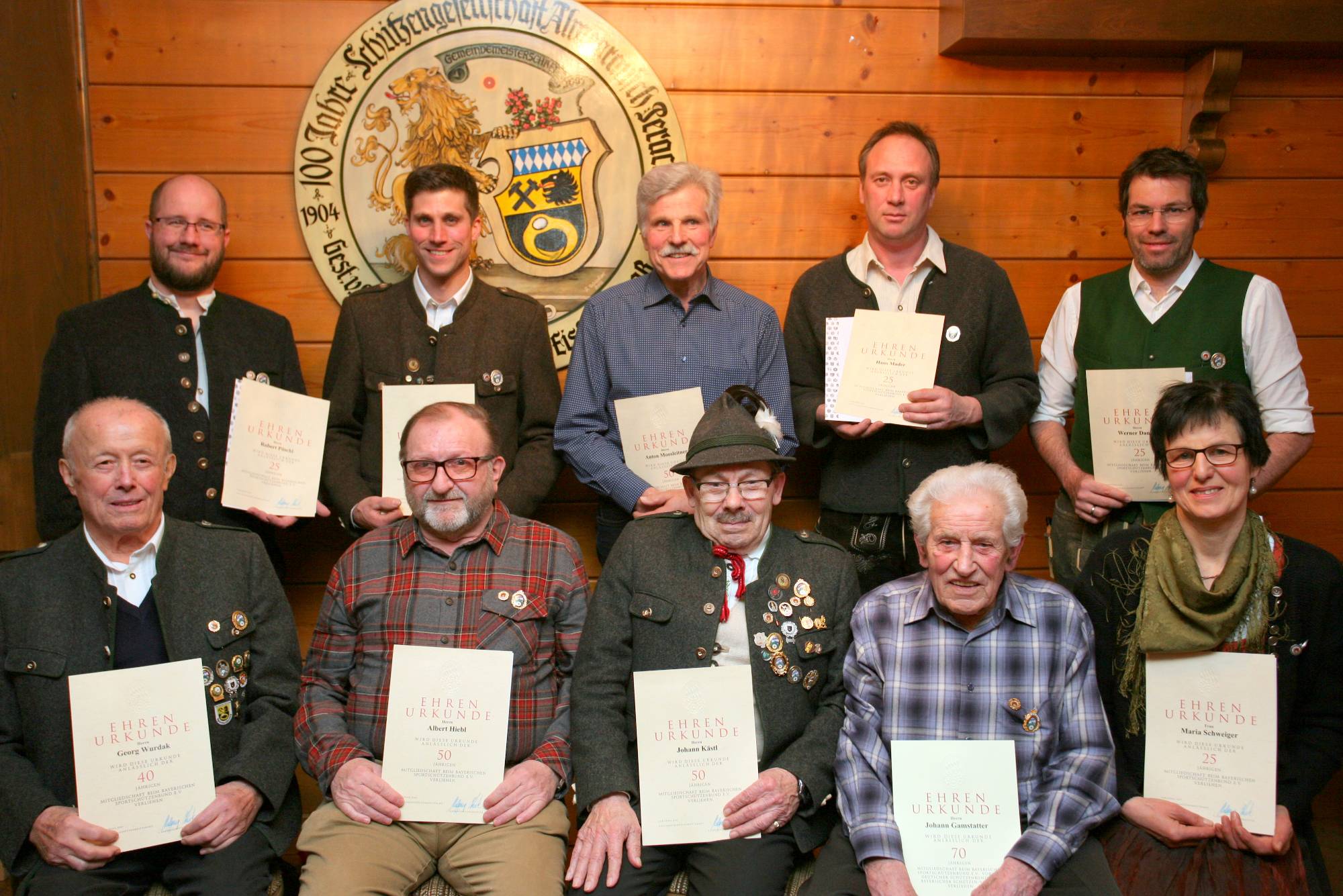 Auf unserem Gruppenbild sind alle Geehrten vorne von links Georg Wurdak (40 Jahre), Albert Hiebl (50), Hans Kästl (50), Hans Gamstatter (70), Maria Schweiger (25) sowie hinten von links : Robert Pöschl (25 Jahre), Florian Moosleitner (25), Toni Moosleitner (50), Hans Mader (25), Werner Danzer (25).