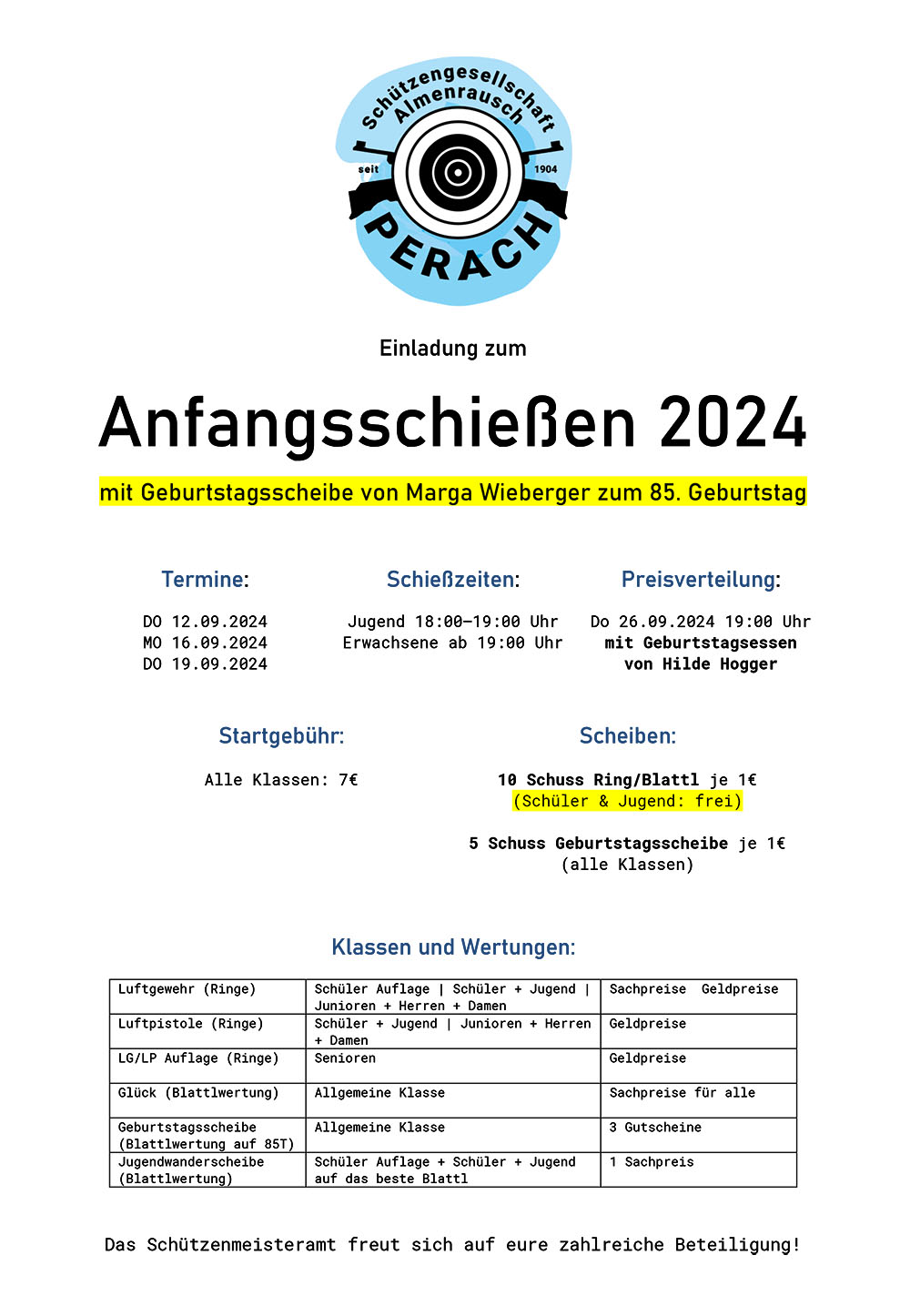 Am kommenden Donnerstag starten wir bereits mit dem Anfangsschießen, bei dem die Geburtstagsscheibe zu Ehren von Marga Wieberger (85 Jahre) ausgeschossen wird. Es gibt dafür drei Termine: