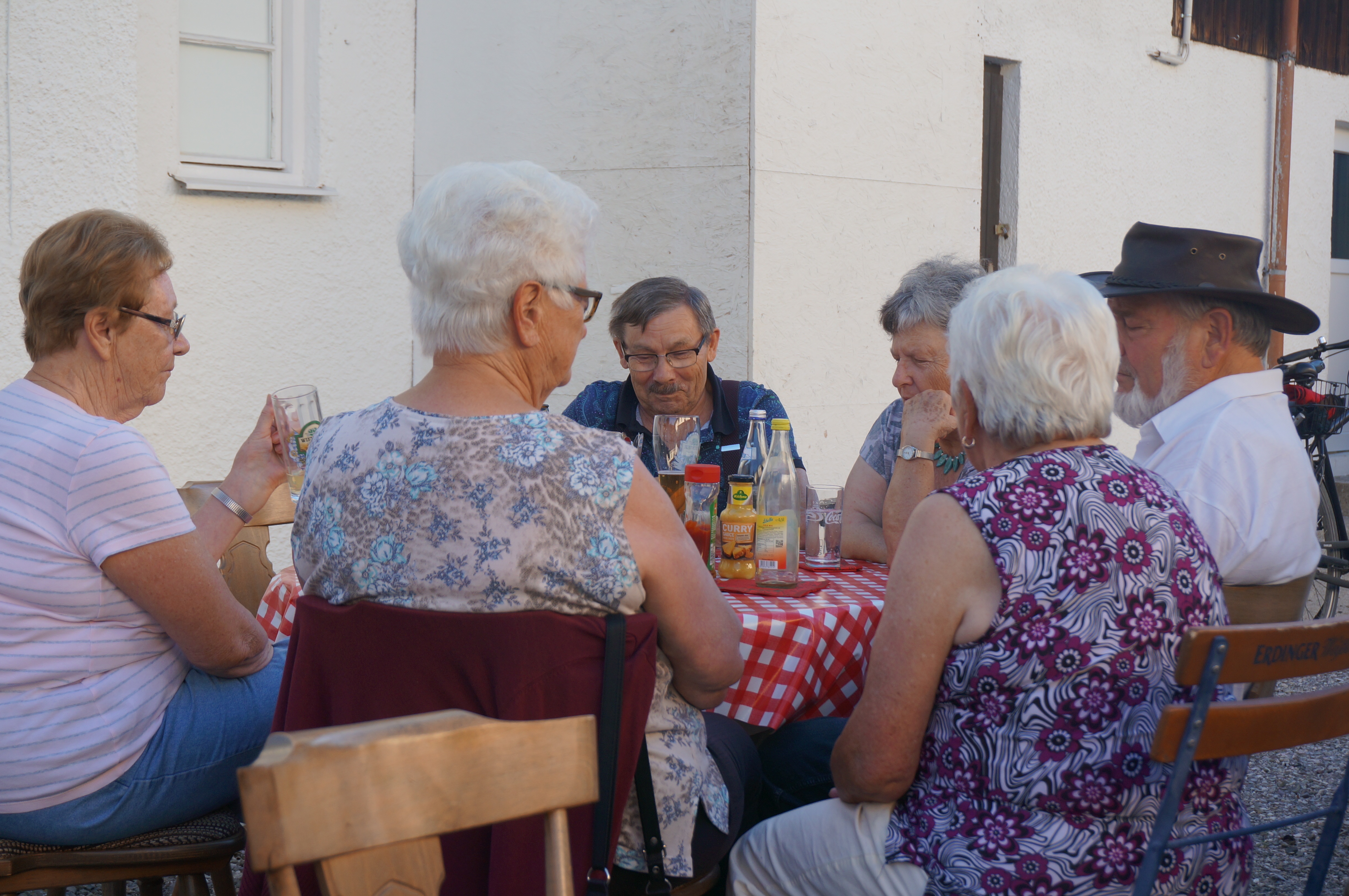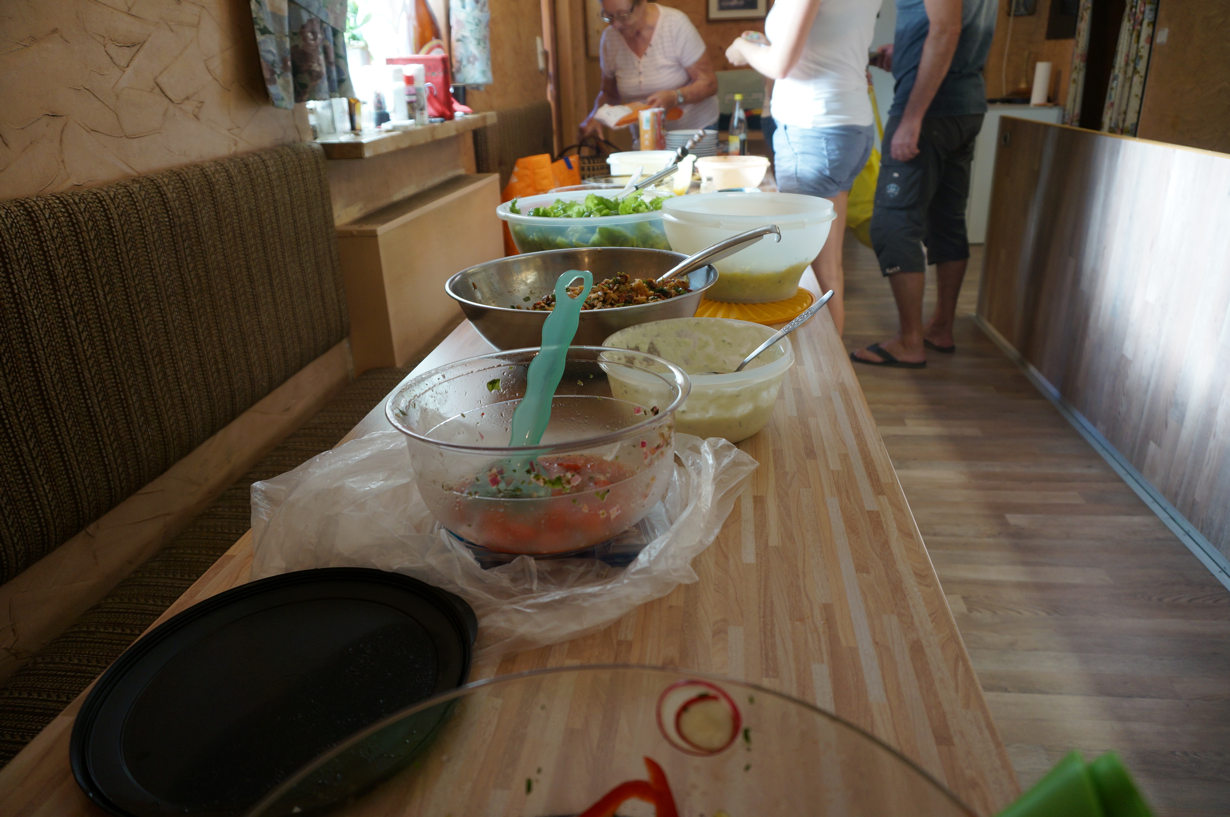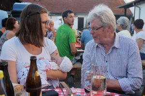 Aufgestellte runde Tische mit karierter Tischdecke und Bierzeltgarnituren sowie die glühende Grillkohle sorgten für das richtige Flair. Grillstimmung verspürten die Gäste als herzhafter Duft in ihrer Nase den Appetit anregte. Spätestens zu diesem Zeitpunkt kam bei jedem der Heißhunger auf ein schönes gutes Stück vom Glutofen. Die mitgebrachten Salate bildeten ein sehr vielfältiges Buffet.