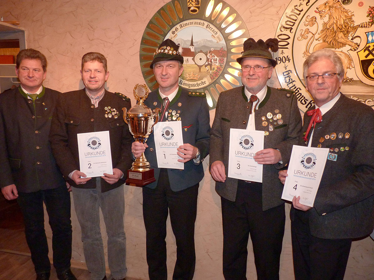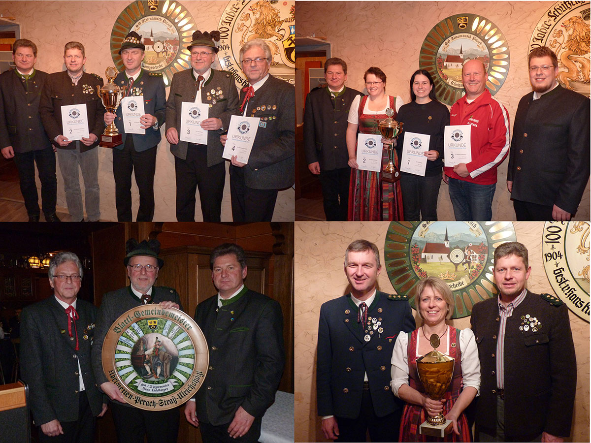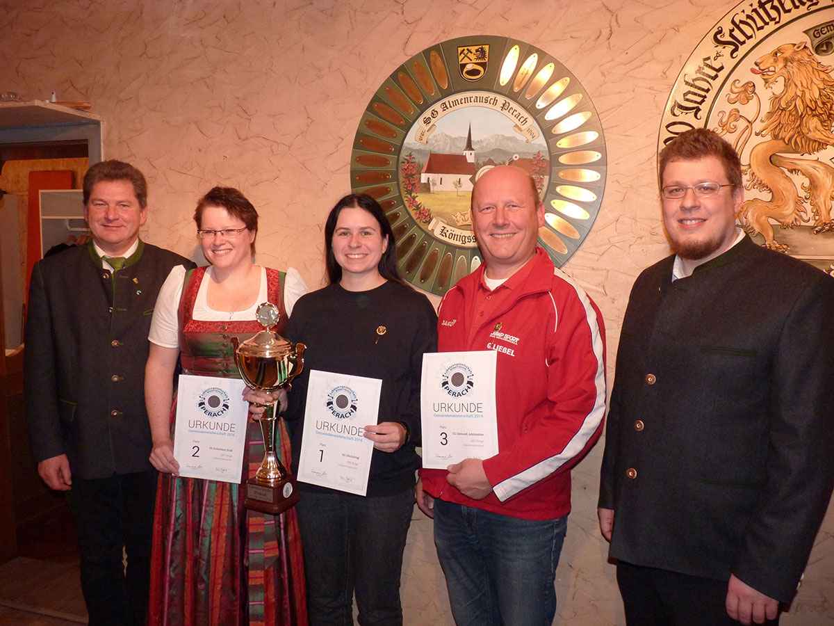 Nach der Verteilung der Gewinne des Preisschießens (eigener Bericht folgt) wurde zum mit Spannung erwarteten Abschluss die Mannschafts-Reihenfolge der Gemeindemeisterschaft von Schützenmeister Alois Fritzenwenger und 2. Bürgermeister Gerhard Kern bekannt gegeben. In der Mannschaftswertung Luftgewehr kamen jeweils die zwölf Ringbesten in die Wertung, in der Disziplin Luftpistole je fünf Schützen mit den höchsten Ringzahlen. Die SG Eichenlaub Straß wurde der Favoritenrolle gerecht und gewann mit 1677 Ringen vor der SG Adelstetten (1650), SG Ulrichshögl (1640) und SG Perach (1541) die Mannschaftswertung auf Ringe in Luftgewehr. Die SG Ulrichshögl erreichte mit 685 Ringen unangefochten den ersten Siegrang bei der Luftpistole, vor Straß (657), knapp dahinter Adelstetten (655) und Perach (645).