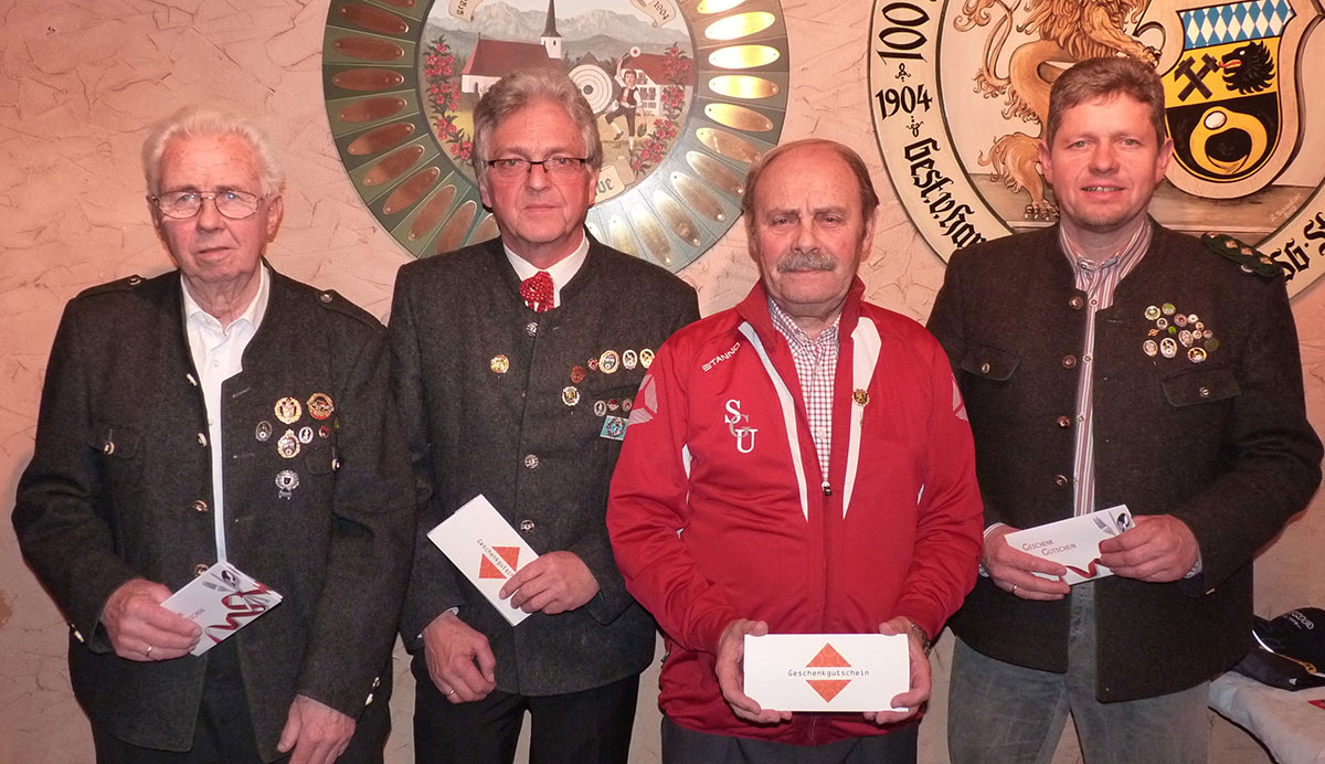 Die beschränkt ausgeschossene Ehrenscheibe ging zur Freude des Ausrichters SG Almenrausch Perach an einen aus ihren Reihen, nämlich an Alois Fritzenwenger (3.4 -Teiler). Die nächsten Plätze eroberten Franz Hogger mit einem 13.65-Teiler (Perach), Franz Schindler (16) Adelstetten, Walter Selzer (21.84) Ulrichshögl und mit einem 22.53 Teiler Michael Oberndorfer (Straß). Fünf Essensgutscheine winkten auf die beschränkte Ehrenscheibe. – schl