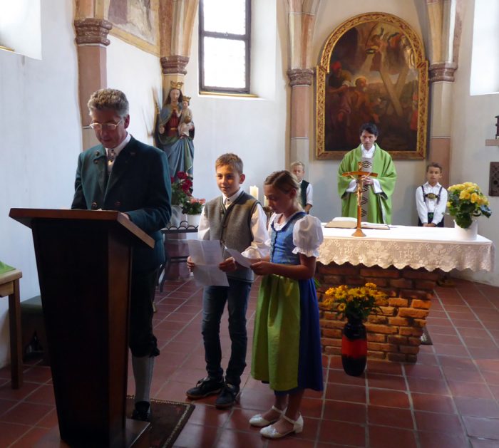Die Fürbitten trugen von den Schnalzern Franz Schweiger und für die Almenrausch Schützen die Geschwister Isabell und Benedikt Prantler vor. Unter anderem kamen die Bitten: „Für alle Männer und Frauen, Jugendliche und Kinder, die sich in unseren Vereinen engagieren. Lass ihren Dienst zum Gewinn werden, für andere und für sich selbst“ sowie „für alle verstorbenen Mitglieder der Peracher Vereine. Lass sie im Himmel voll Freude dieses Fest mit uns feiern.“