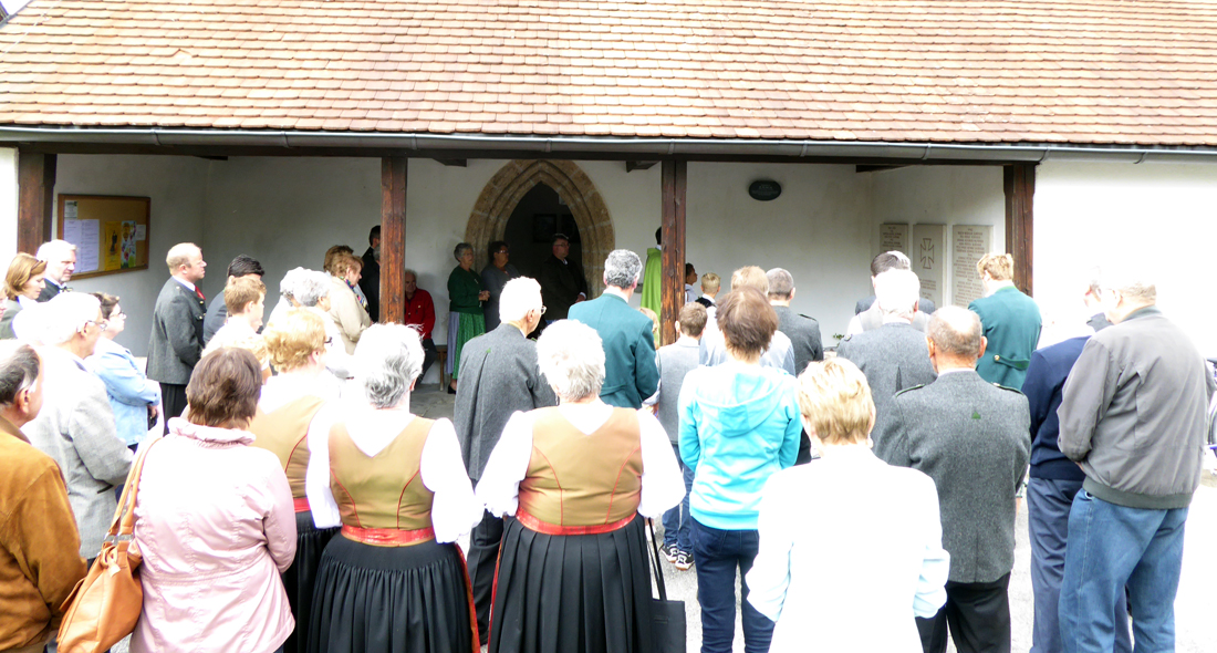 Mit Beifall wurde Pfarrer Bien empfangen, da er wegen einer Hochzeit verspätet zur Feier des Jahrtages eintraf. Unter Orgelbegleitung von Hans Stehböck sangen die Gläubigen zur Eröffnung das Lied „Nun jauchzt dem Herren, alle Welt.