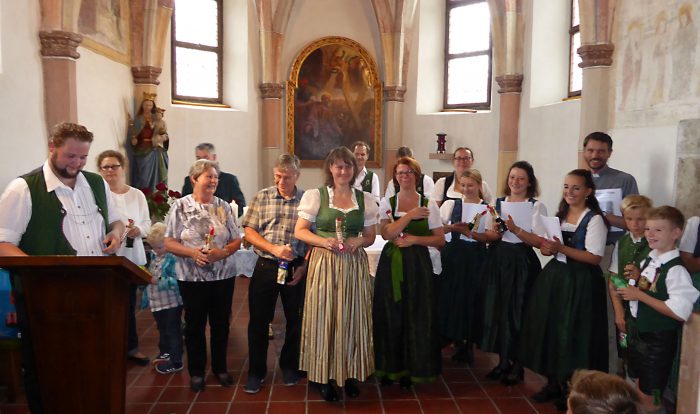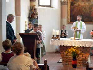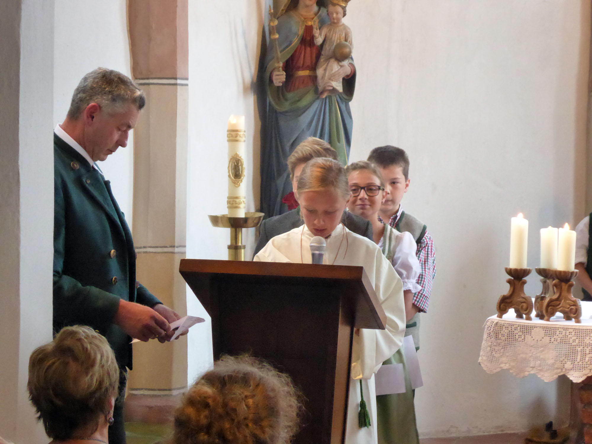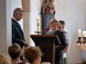 Nach der Predigt sagte Bien: „Beim Herrgott zu seien ist eine schöne Möglichkeit, wenn man ministriert.“ Hier dankte er dem scheidenden Maximilian Gamstatter mit einem Präsent. Dessen Schwester Lena bekam nachher die Ministranten-Albe, das Zingulum umgeschnürt und ein Kreuz umgehängt. Sie bekräftigte ihre Bereitschaft für den Ehrendienst. Beide bekamen von der zahlreichen Christenschar Applaus. Das „Credo“ wurde mit der Ziach eingespielt und die Zuhörer bekamen eine vortreffliche Intonation zu hören. Die Fürbitten sprachen hernach Franz Schweiger und mehrere Kinder, ganz im Anliegen des Jahrtages.