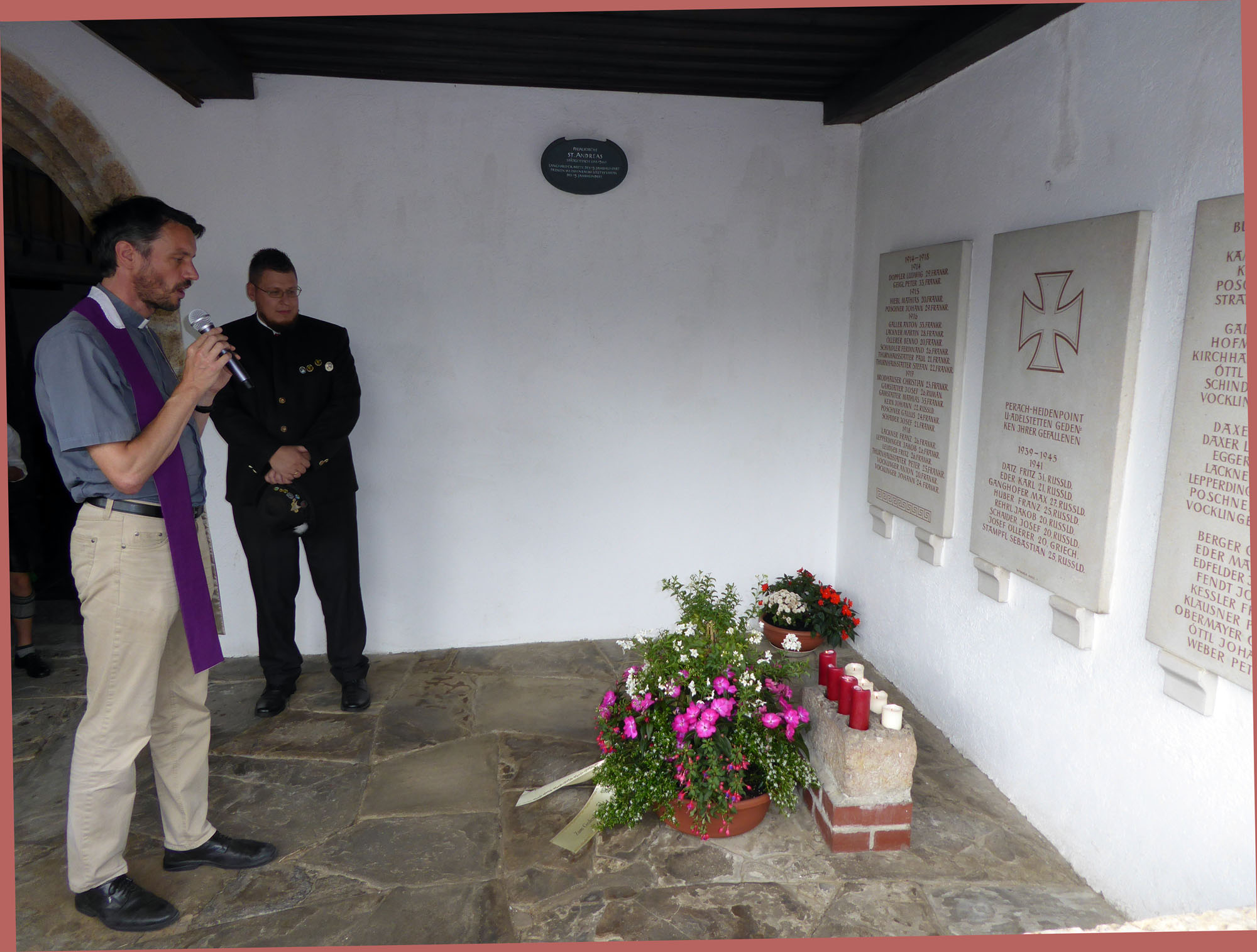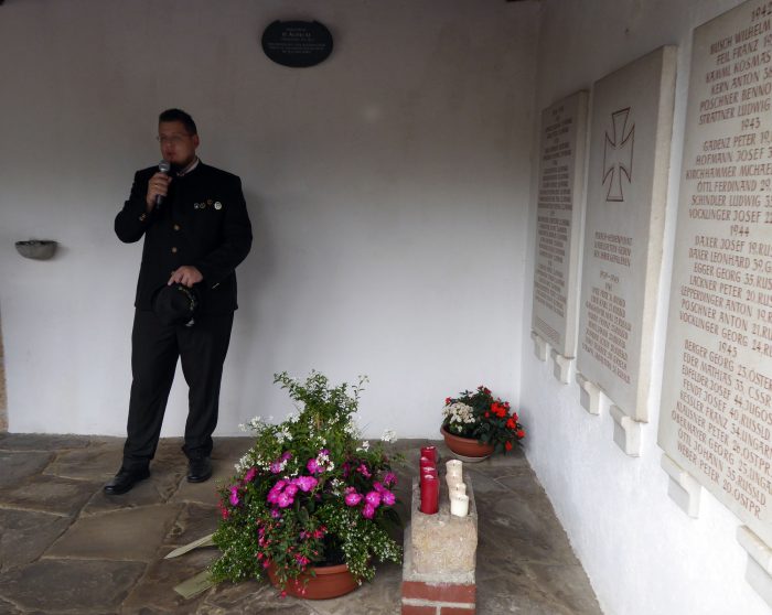 Danach begaben sich Jung und Alt ins Freie und in der Vorhalle beim Kriegerdenkmal Pfarrer Wernher Bien sang Gebetsrufe und anschließend beteten alle ein Vaterunser und ein Gegrüßest seist du Maria. Stellvertretend für die Ortvereine legte 1. Almenrausch-Schützenmeister eine Blumenschale vor der Wand mit den Ehrentafeln nieder.
