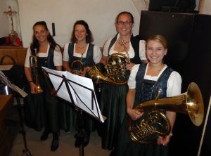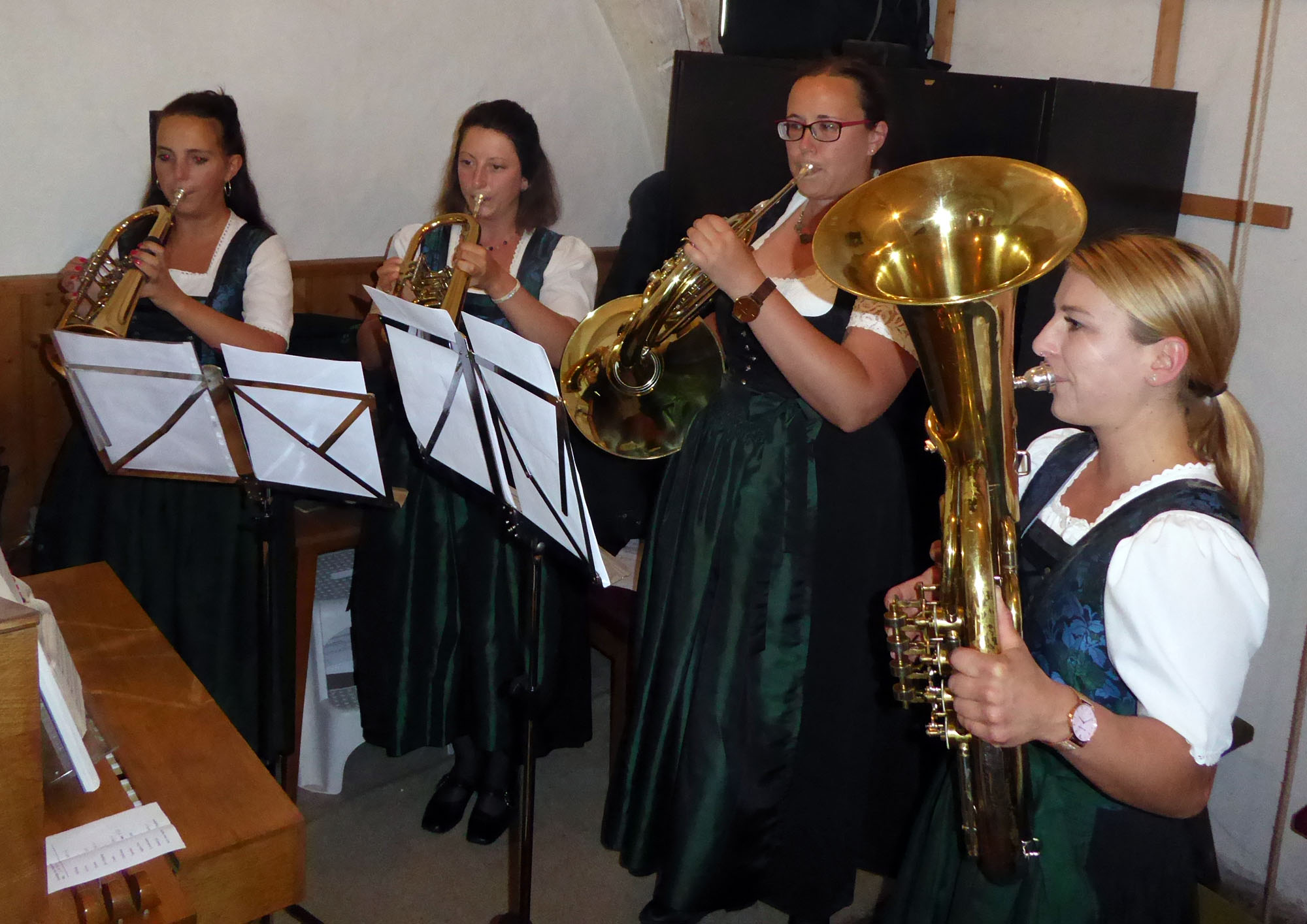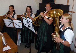 Für die musikalische Gestaltung sorgten das Bläserquartett: Bei den „Glorreichen Vier“ mit Sabrina Dusch, Carina Bogner (beide Flügelhorn), Christine Burk (F-Horn) und Verena Hogger (Bariton) sowie der „Ainringer Vierg’sang“ mit Sonja Mittermaier-Moka (Sopran, Gitarre), Kathrin Hofhans (Alt, Klarinette), Thomas Moka (Tenor, Ziach), Christian Hofhans (Bass, Trompete und Richard Dusch (Kontrabass).