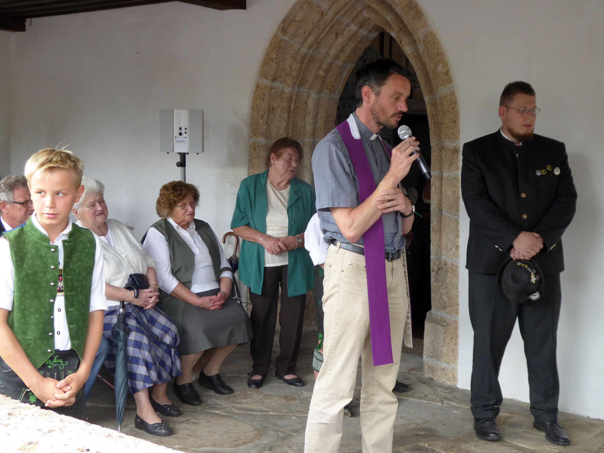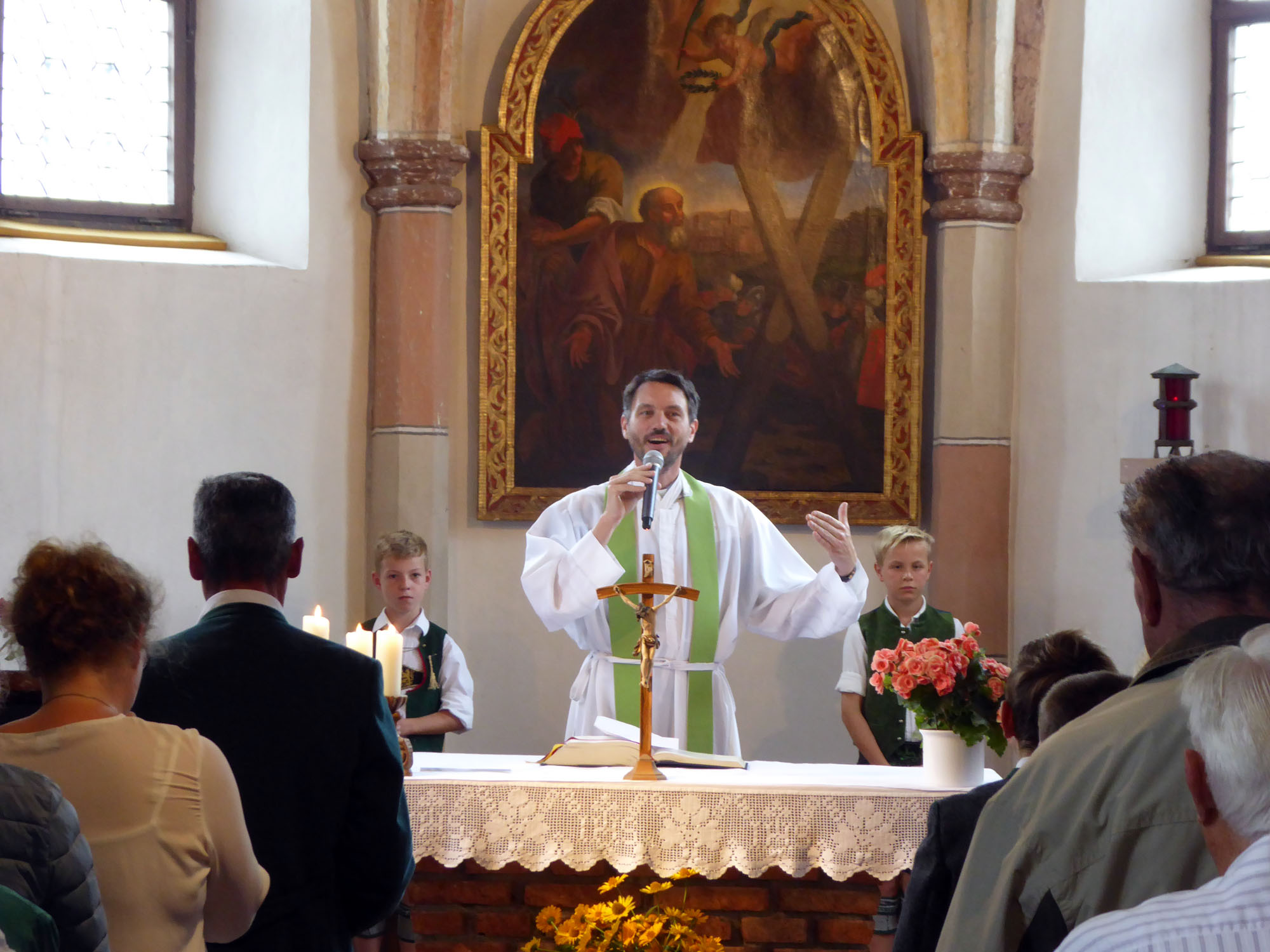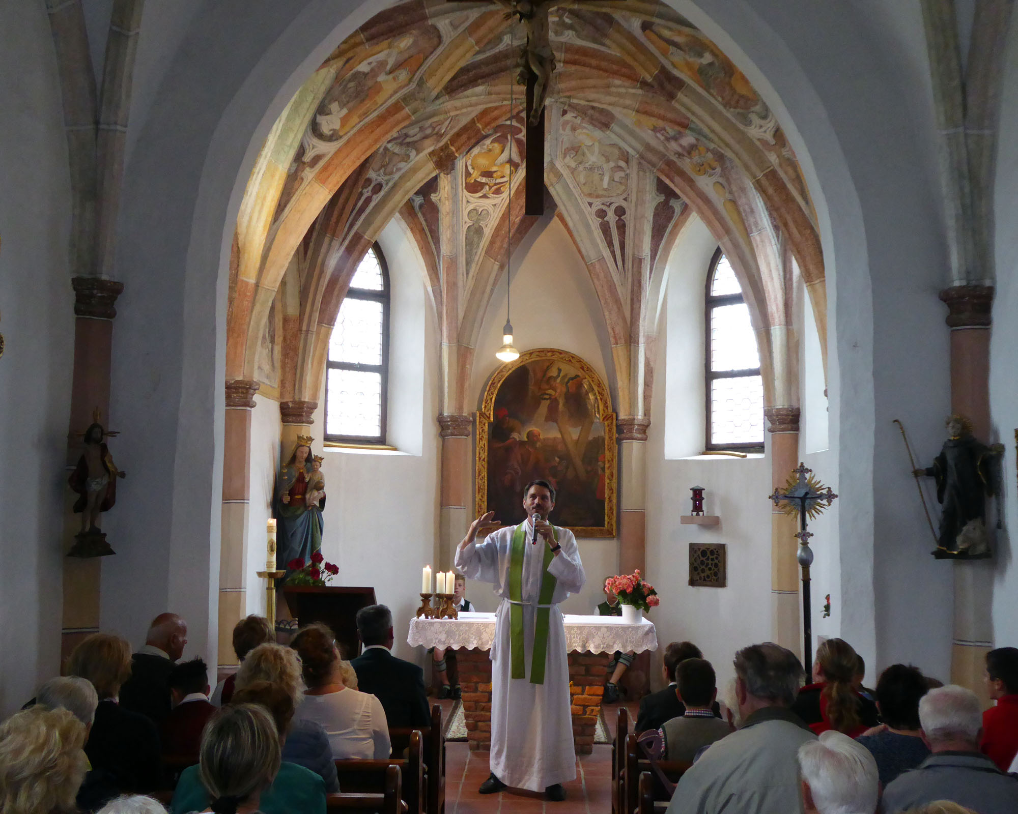 Das Markus-Evangelium verkündete der Geistliche und nahm in seiner Ansprache dazu Bezug. Zur Kirche meinte er, die von außen unscheinbar ausschaue, aber innen seien das Netzgewölbe und die Fresken vorne im Altarraum ein Schatz. Als