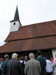 Überfüllt war die Filialkirche „St. Andreas“, Gläubige mussten in der Vorhalle und im Freien mit einem Platz vorlieb nehmen. Grund war die Uraufführung der vom Thomas Moka komponierten „Quirinus-Messe“ beim Jahrtag der Ortsvereine Eisstockclub, Schützengesellschaft Almenrausch und der Schnalzer. Dem Gottesdienst folgte ein Totengedenken am Kriegerdenkmal durch Pfarrer Wernher Bien. 1. Schützenmeister Markus Burgthaler von der SG Almenrausch legte eine Blumenschale nieder.