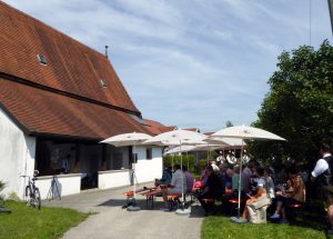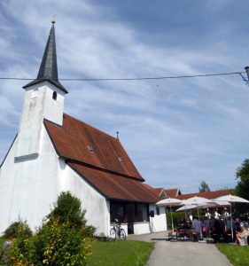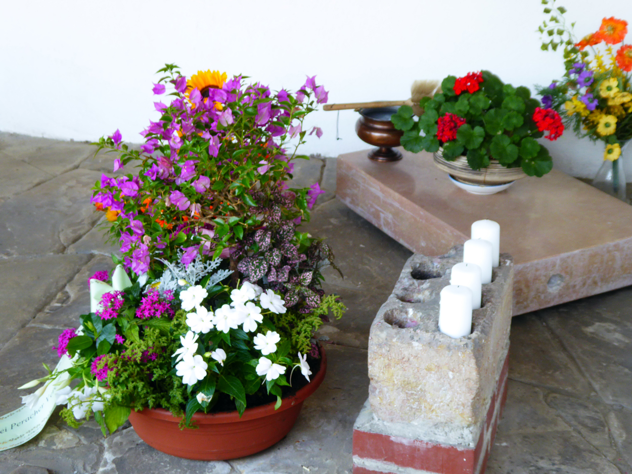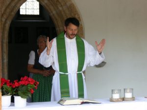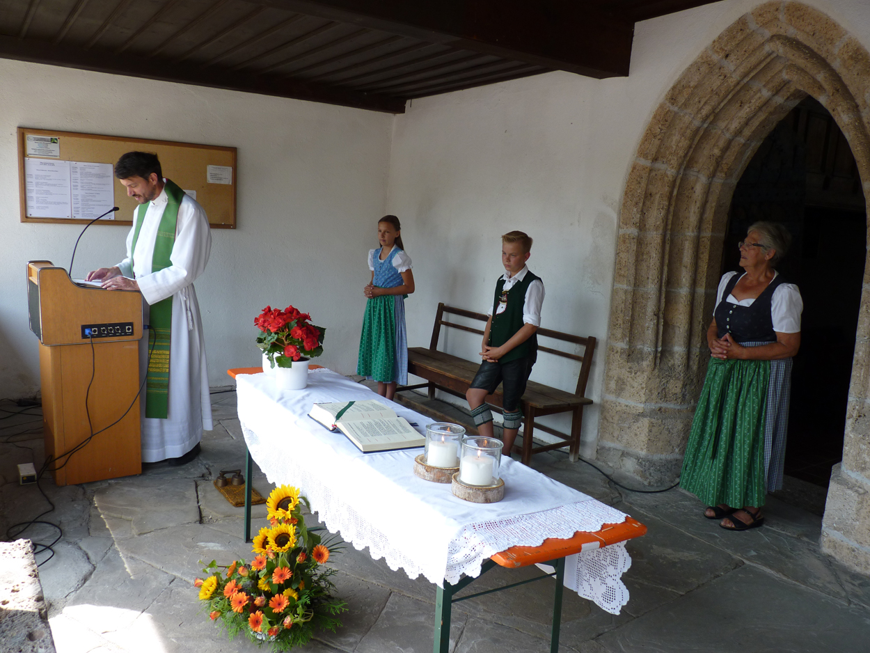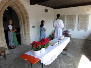 Vor Beginn des nachmittäglichen Gottesdienstes wurde ein Bierzelttisch mit weißen Tüchern versehen und Mesnerin Erika Geigl sorgte für den Blumenschmuck. Blätter mit den Texten der Lieder wurden verteilt.