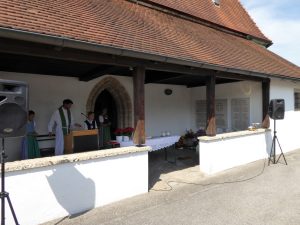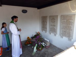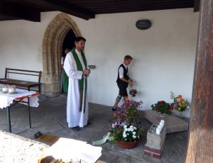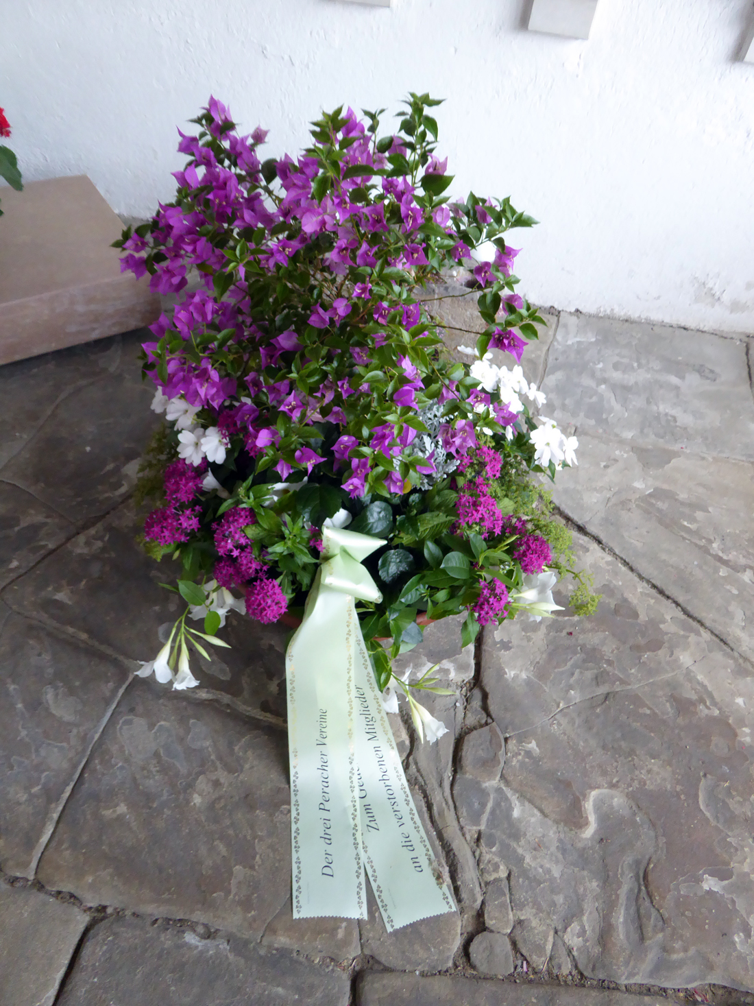 Für die drei Vereine stellte er eine mit Seidenstreifen versehene Blumenschale vor dem Kriegerdenkmal ab. Tom Heinrich stellte als äußeres Zeichen eine weitere Schale hinzu. Pfarrer Wernher Bien besprengte anschließend die Blumen und die Ehrentafeln an der Wand von der Vorhalle der Filialkirche mit Weihwasser. Die Musikkapelle intonierte altgewohnt die Melodie vom „Guten Kameraden“.