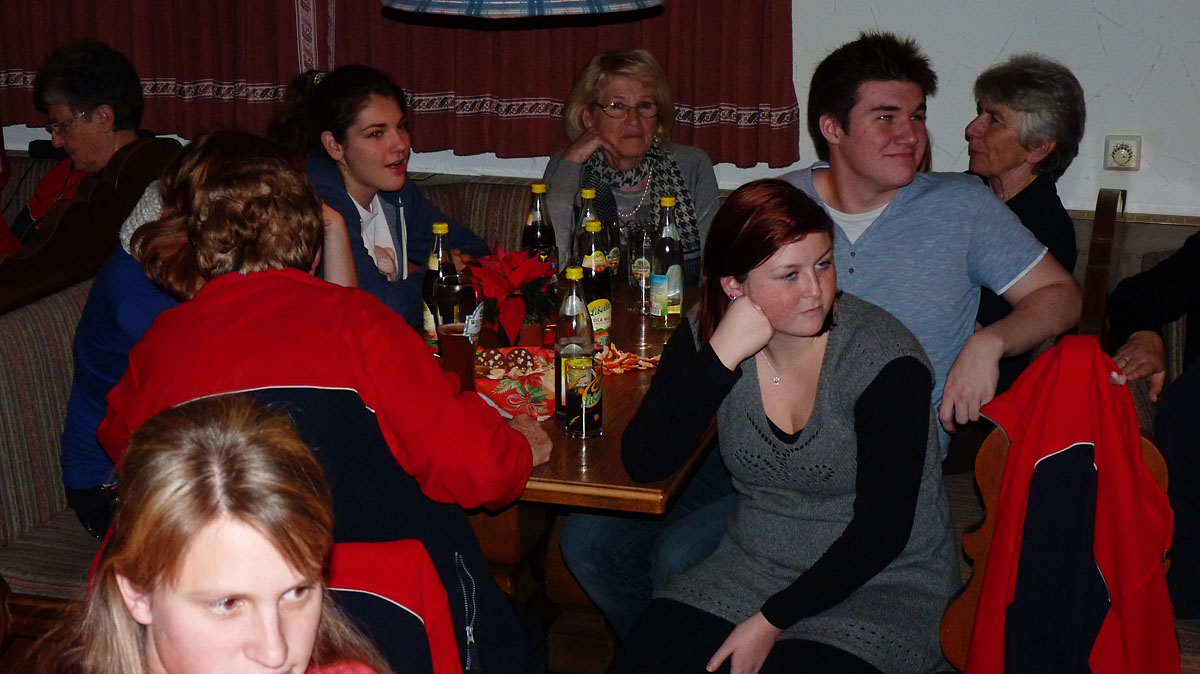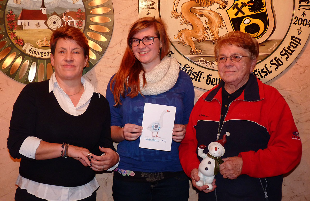 Der Nikolaus mit seinen Krampussen verteilte an alle anwesenden Kinder ein bunt gemischtes Sacker’l und vor seiner Verabschiedung zog der Nikolaus noch die „Siegernummer“. Danach begab sich der „Nikolo“ gemessenen Schrittes mit seinen fuchtelnden Gefährten wieder außerhalb des Schützenstüberls. Nach einer kurzen Pause ging es bei den anwesenden Schützen nun zur ersehnten Preisverteilung. Zu gewinnen gab es einen Gutschein für eine Weihnachtsgans, einen selbstgebackenen Weihnachtsstollen von Hilde Hogger bis zu weihnachtlichem Deko, wärmende Getränke, herzhafte Brotzeiten und viele andere nützlicher Dinge für die kalte Jahreszeit. Jeder Teilnehmer konnte sich einen Preise sichern. Als glückliche Gewinnerin ging dieses Jahr Nadine Mertl hervor, die vor Christa Gamstatter und Reingard Mertl das Nikolausschießen für sich entscheiden konnte. Weitere Platzierte: 4. Nina Mertl, 5. Hans Geigl, 6. Georg Wurdak, 7. Markus Fundeis, 8. Hans Kästl, 9. Martin Geigl, 10. Heidi Kästl – 34 Preise wurden vergeben.