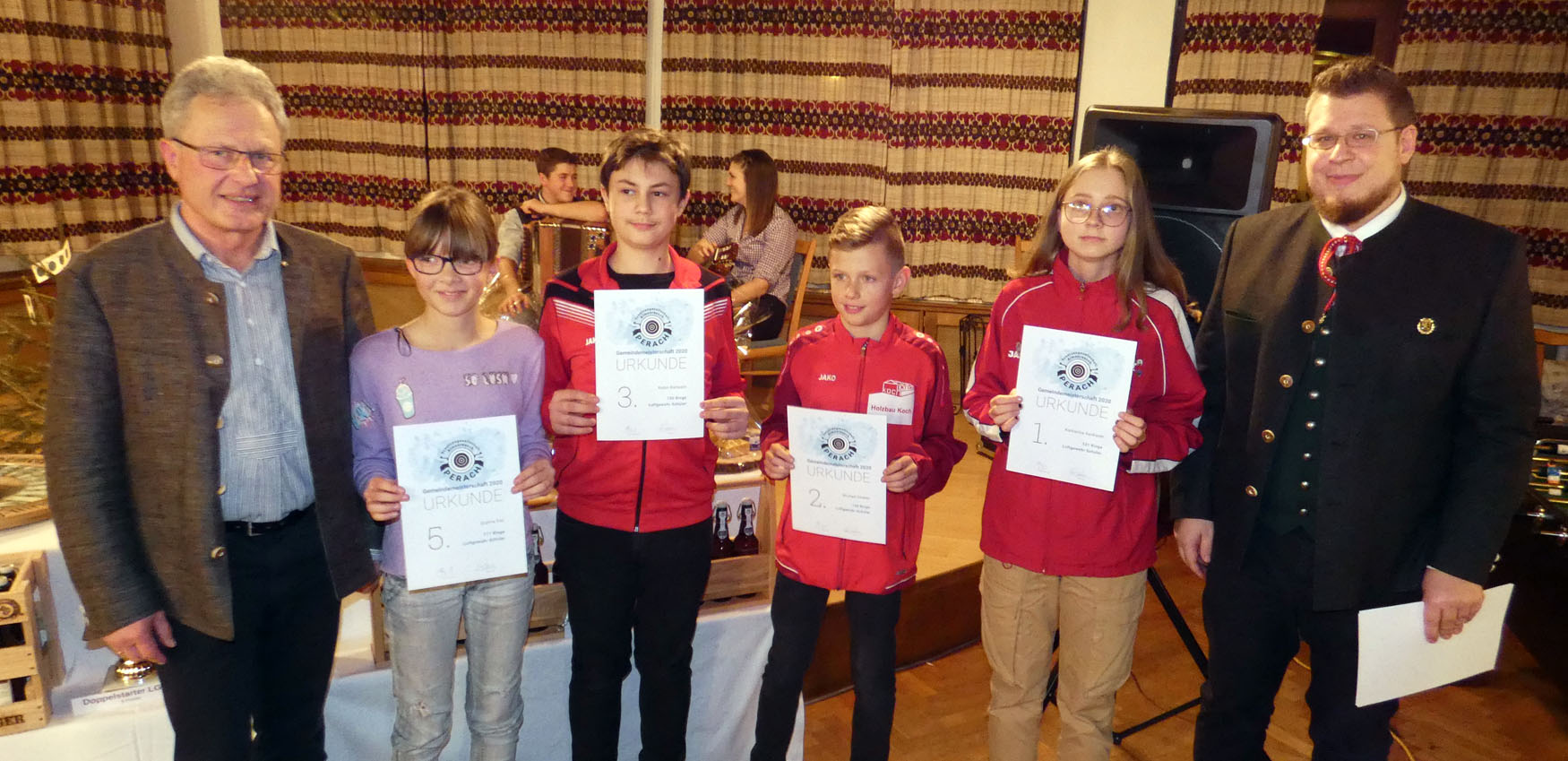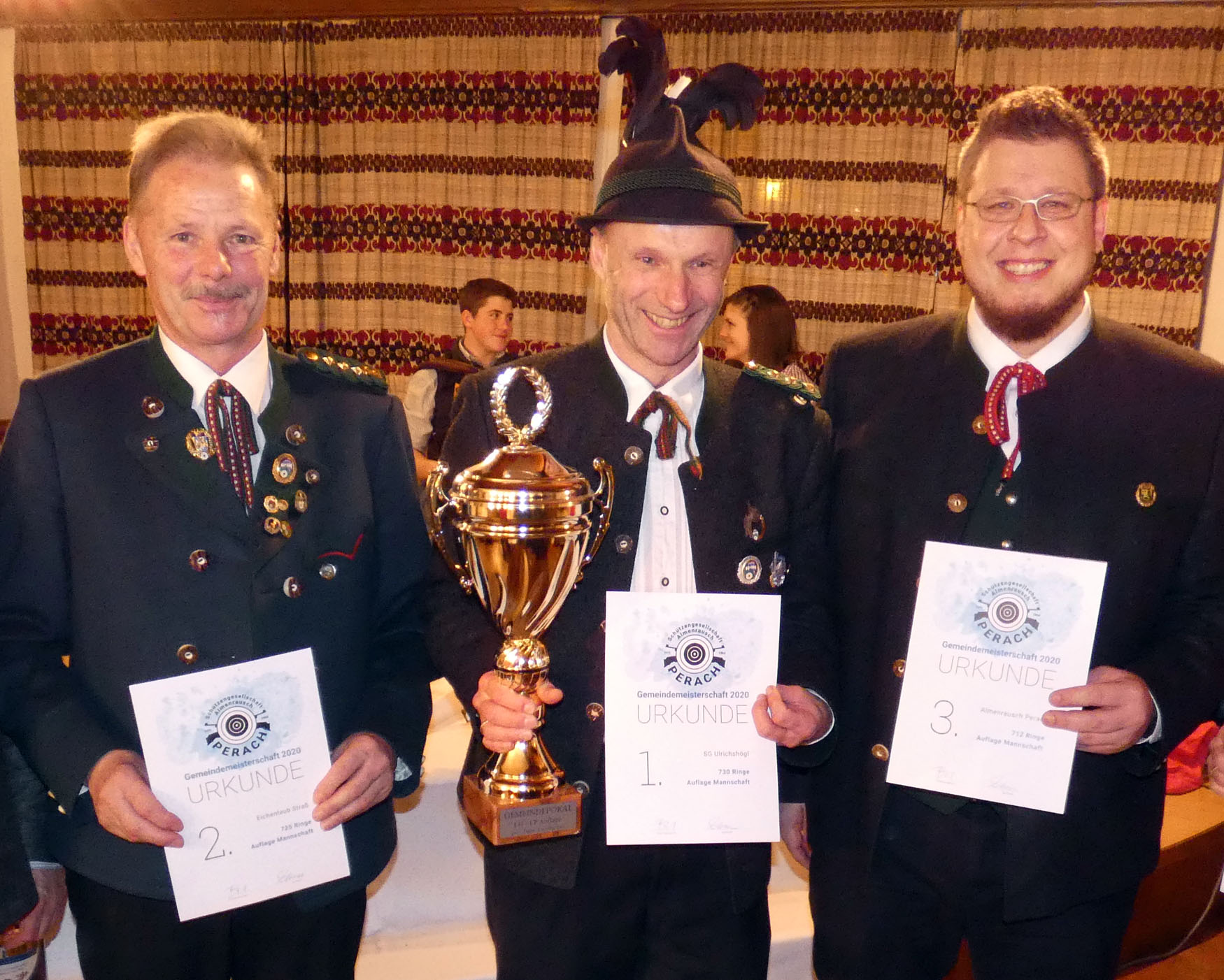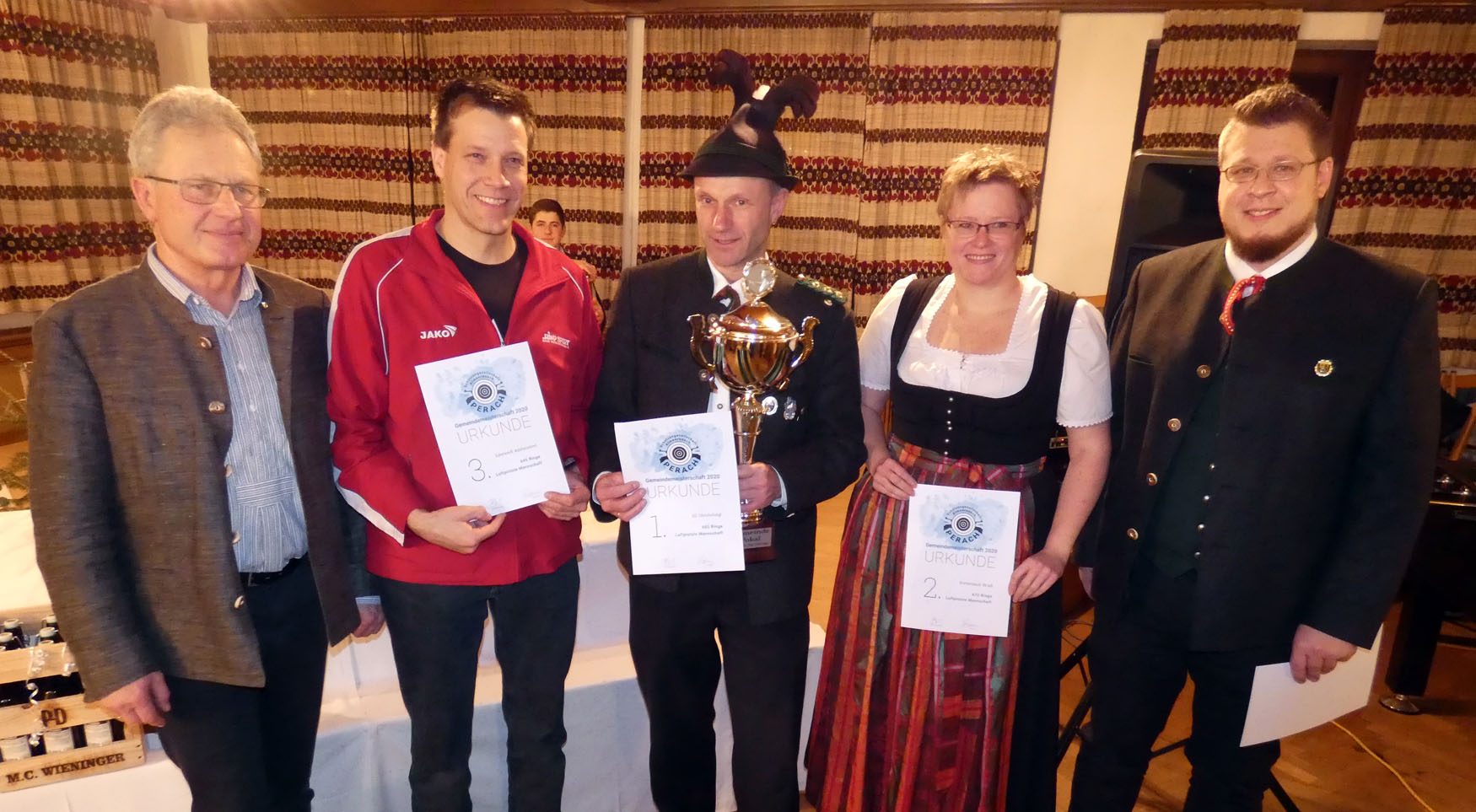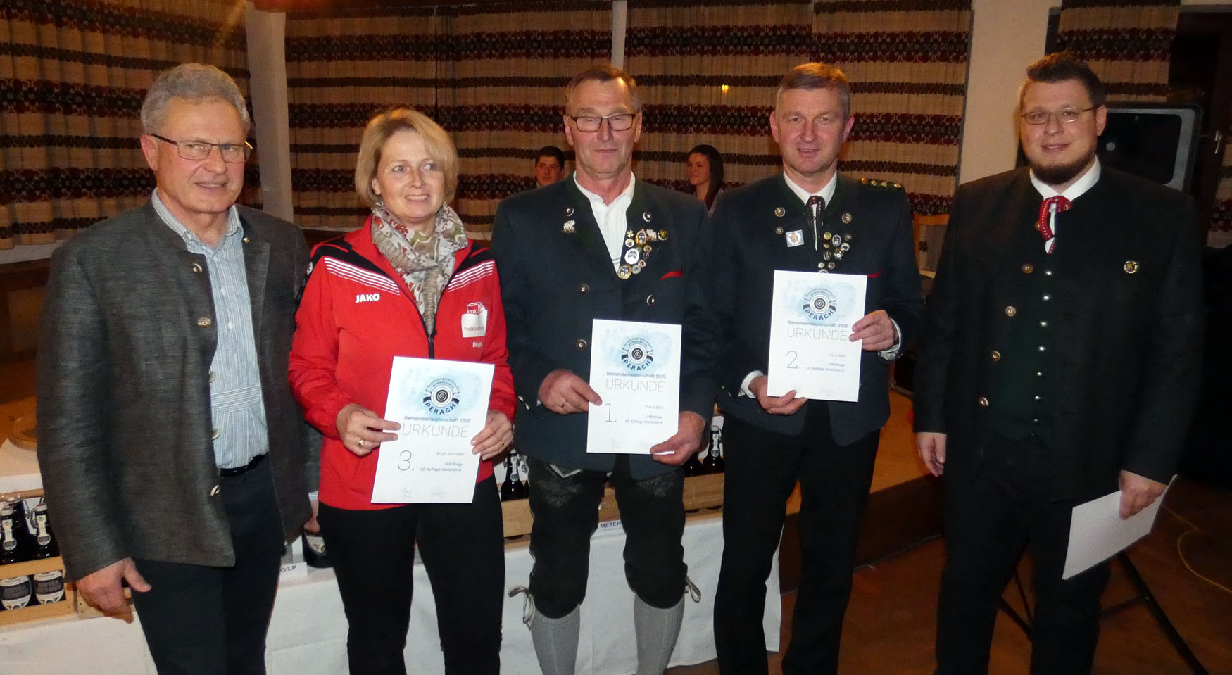 Der begehrte Wanderpokal für die beste Luftgewehr-Mannschaft konnte sich im letzten Jahr die Schützen aus Adelstetten sichern. Beim nun notwendigen neuen Pokal ließ sich Bürgermeister Hans Eschlberger die Ehre nicht nehmen einen solchen zu stiften. Mit deutlichem Vorsprung hatte die SG „Eisenlaub“ Straß die größte Zielsicherheit. Mit 1657 Ringen wurden sie Ainringer Mannschaftsmeister.