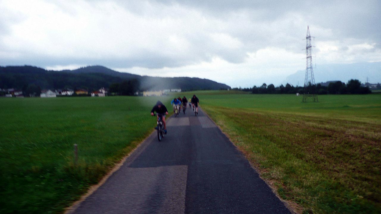 Bei doch etwas unsicherem Radlwetter starteten die „Traditions-Radler“ und Neueinsteiger vom Treffpunkt am Kraftwerk an der ehemaligen Grenze zunächst entlang der Flüsse Saalach und Salzach. Den Beteiligten boten sich herrliche Ausblicke in die heimische Bergwelt, dem Voralpenland und der stolzen Festung Salzburg über die Mozartstadt. Die Salzach überquerte die Gruppe bei der ersten Brücke und man radelte zumeist abseits von Kfz-Verkehr auf Radwegen oder Nebenstraßen über Bergheim, Muntigl, Siggerwiesen, Lederersiedlung, Anthering. Dort musste wegen eines kurzzeitigen Gewitters eine Zwangspause eingelegt werden, belohnt für den Zwischenstop mit dem Naturphämomen eines herrlichen Regenbogens. Schließlich wurde die „Schlussetappe“ Acharting in Angriff genommen, wo alle wohlbehalten ankamen.